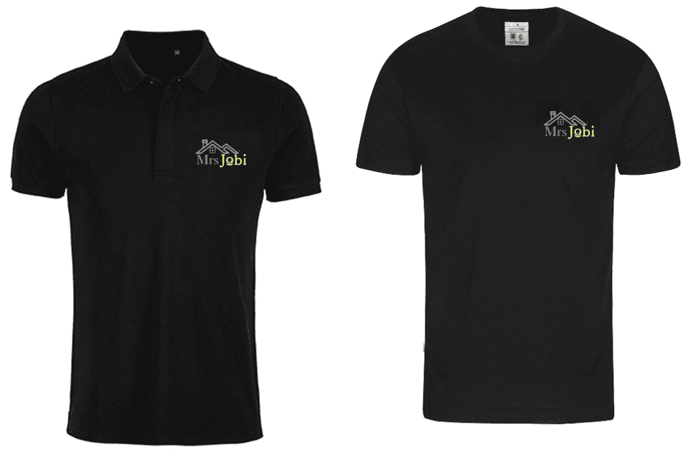 2 x Quality polos or T-shirts with professionally embroidered Mrs Jobi logo on the breast pocket, available in different sizes.