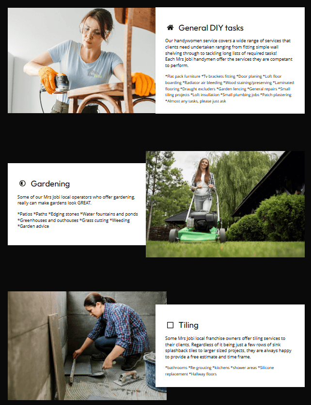 Your very own professional unique Mr Jobi web page with chosen subdomain for example visit: www.mrsjobi.uk/abc web address. On your webpage etc, we will display the specific services that you want to provide. Some Mr Jobi franchise owners offer lots of different services, where as other franchisees choose to offer selected services with perhaps an intention to expand and offer additional in the future.
